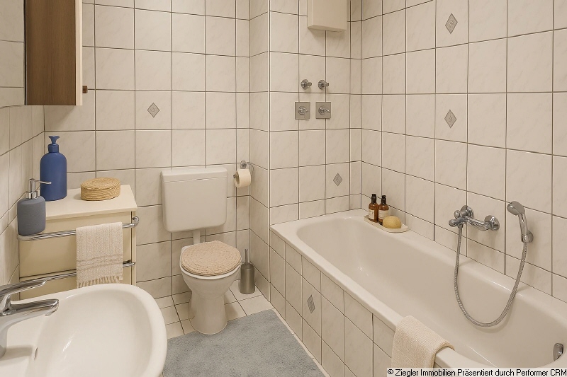 Die Wohnung befindet sich in guten und gepflegtem Zustand. Die Wohnräume sind mit Laminatboden ausgestattet, der Flur, die Küche und das Badezimmer sind hell gefliest. Die Balkontüre ist mit einem Fliegengitter ausgestattet (individuell angepasst). Um die Privatsphäre der Bewohner zu schützen, wurde die Inneneinrichtung mit KI bearbeitet.Lage