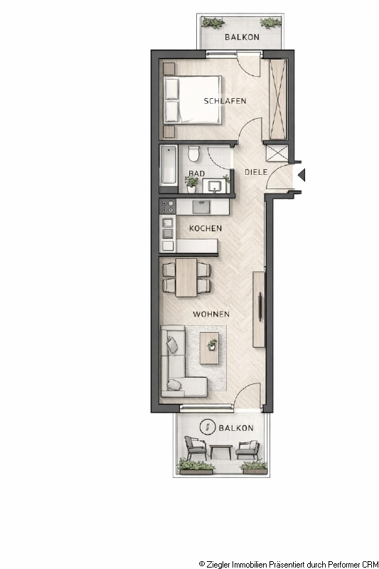 Die sehr gut geschnittene 2-Zimmer-Wohnung befindet sich im 3. Obergeschoss eines gepflegten Mehrfamilienhauses und ist bequem über einen Aufzug erreichbar. Der klare Grundriss überzeugt durch eine funktionale Raumaufteilung mit separatem Schlafzimmer, offen gestaltetem Wohn- und Essbereich mit halb integrierter Küche sowie einem innenliegenden Badezimmer. Zwei Balkone sorgen für zusätzlichen Wohnkomfort und erweitern den Wohn- und Schlafbereich ins Freie. Die Diele bietet einen angenehmen Eingangsbereich mit kurzen Wegen in alle Räume. Zur Wohnung gehört ein eigener Kellerraum. Im Kellergeschoss steht den Bewohnern zudem ein gemeinschaftlicher Hauswirtschaftsraum mit Münzwaschmaschine und Münztrockner zur Verfügung. Der Triplex-Parker ist aktuell nicht vermietet.Ausstattung