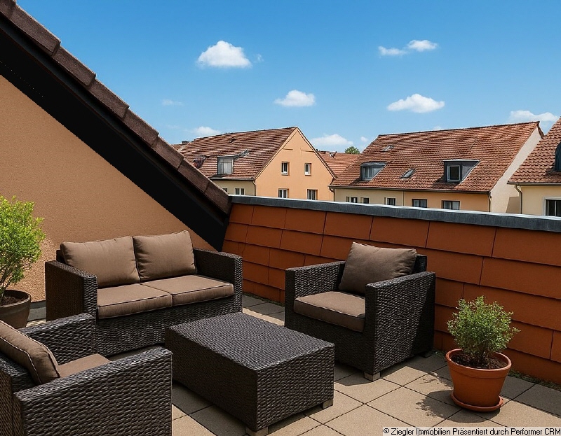 Bei der Maisonette-Wohnung handelt es sich um zwei Eigentumswohnungen im 3. OG und im DG, die durch einen Deckendurchbruch und den Einbau einer Treppe zu einer Wohneinheit verbunden wurden. Raumaufteilung der ersten Ebene: Diele, Hauswirtschaftsraum, Badezimmer mit Dusche, Bidet und Doppelwaschbecken, separates WC mit Waschbecken sowie zwei Schlafzimmer. Über eine Treppe in der Diele gelangt man in die zweite Ebene mit folgender Raumaufteilung: Treppenaufgang mit Galerie (gut geeignet als Arbeitsbereich), Diele, Küche, Badezimmer mit Badewanne, WC und Waschbecken, Zimmer mit angrenzender Dachterrasse sowie ein großer Wohn- und Essbereich, der ebenfalls über einen Zugang zur Dachterrasse verfügt. Zur Wohnung gehören zwei Tiefgaragenstellplätze und zwei Kellerräume. Zur gemeinsamen Nutzung stehen Trocken- und Fahrradräume zur Verfügung.Ausstattung